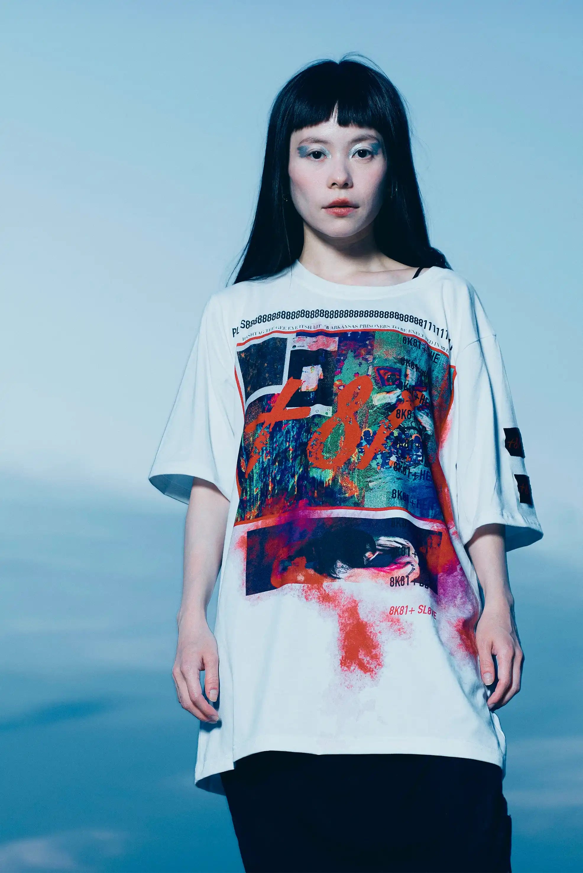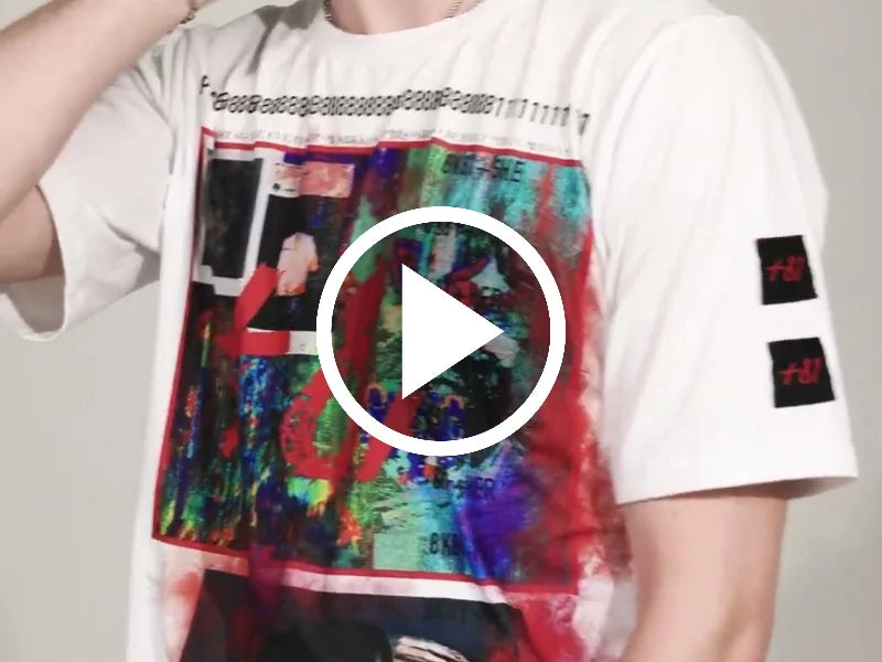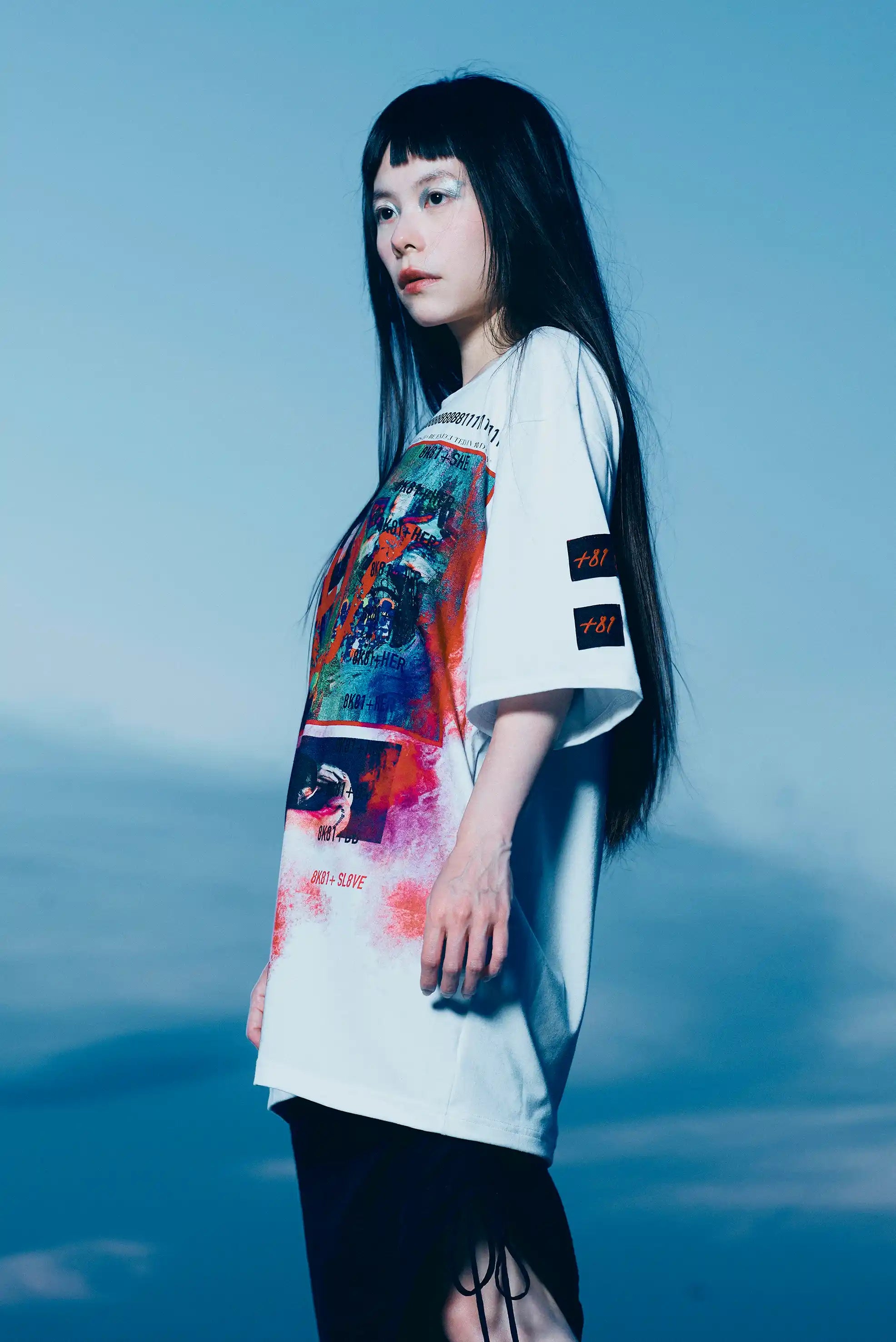 The design is applied to the locally made oversized shirt using sublimation printing, a process where ink turns into gas and fuses with the fabric fibers. The result is color that becomes part of the material itself: vibrant, permanent, and completely intangible to the touch.